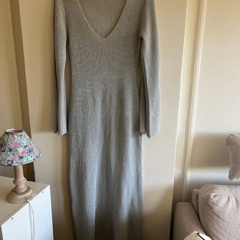 Kjolen har fine perledetaljer på skuldrene og et diskret mønster i stoffet som gir et eksklusivt uttrykk.