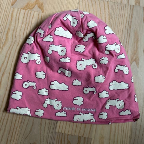 Moods of Norway barne vinterlue i blå farge med mønster av snøkrystaller og traktorer. Luen er i one size og unisex, laget av strikket materiale med fuskepelskant rundt ørene for ekstra varme. Passer til bruk i kalde værforhold. Luen har noen små hull i bremmen som vist på bilde.