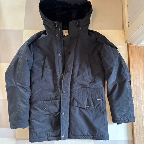 Carhartt WIP W' Battle Parka jakke i størrelse S for kvinner. Jakken er grønn og laget av 65% bomull og 35% polyester. Den har hette og flere lommer, egnet for utendørs bruk og hverdagsbruk. Framstår som ny.