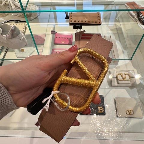 Valentino Garavani damebelte i sort og rød lær. Beltet har en stor gullfarget V-logo spenne