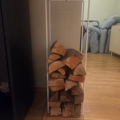Vedstativ/ vedholder til oppbevaring av ved ved peis eller ovn innendørs.