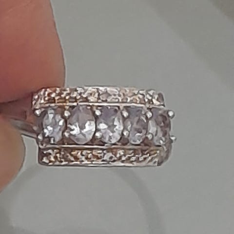 Pent brukt sølvring med ekte sten. Vet ikke hvilket stenslag det er, men tror at det er en norsk stentype. Stemplet 925. Sten med innfatning måler 3 cm. Regulerbar.