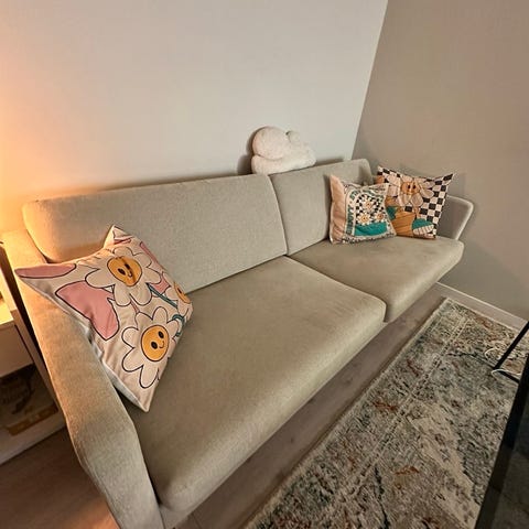 Beige sofa fra Hjellegjerde. Lett buet. Fast og fin, uten sår eller skader. Ca. 10 år. Har stått på hytte siste 5 år og derfor lite brukt. Pall selges ikke.