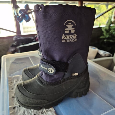 Kamik Finley er en varm og vanntett vinterstøvel for barn med dypt mønstret såle for godt grep. Den uttakbare innvendige sokken Har fukttransporterende egenskaper. Skal tåle temperaturer ned til -32°C. De er i størrelse 27, men de er små i størrelsen i forhold til andre merker så vil si de tilsvarer mer en 26, ca 16,5 cm innvendig mål.