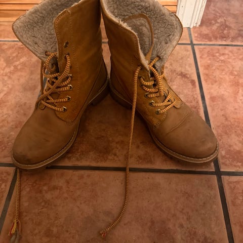 Tamaris Støvler i størrelse 36 for dame. Støvlene er svarte og har snøring foran. De har en solid såle med godt grep. Innvendig er de foret ull som gir ekstra komfort og varme. Skoene er lite brukt.