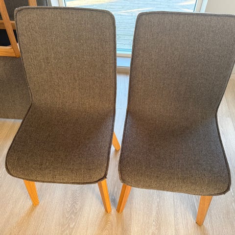 Kjempefine stoler som er gode å sitte på. Pent brukt, ingen skader, men en fot trenger en propp under foten. Mørk grå sete og rygg, svarte ben.