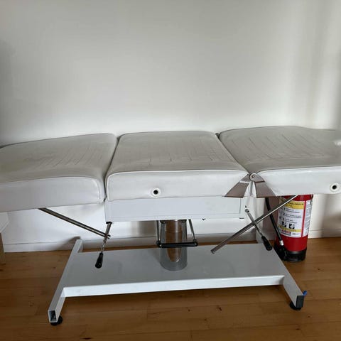 Hydraulisk benk i hvit farge med justerbare seksjoner for hodet og bena. Benken har polstret overflate og metallramme. Inkluderer en hvit krakk. Egnet for bruk i massasjeterapi og skjønnhetsbehandlinger etc.