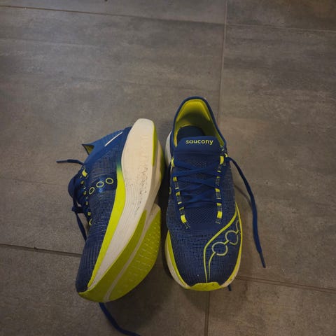 Skoene er brukt ca 10 km fordelt på 2 løpeturer. Selges da de er akkurat for små til meg selv, så har kjøpt en størrelse større. Fantastisk gode sko vil jeg si!
