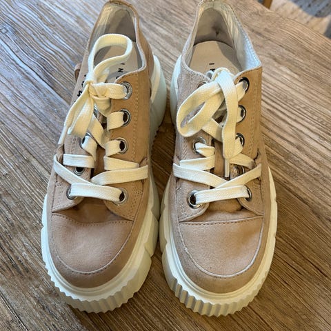Inuikii Loop sneakers joggesko i størrelse 41. Fargen er beige. Skoene har en høy plattform såle og snøring foran. Materialet ser ut til å være tekstil og gummi. Designet er unisex og passer til hverdagsbruk.