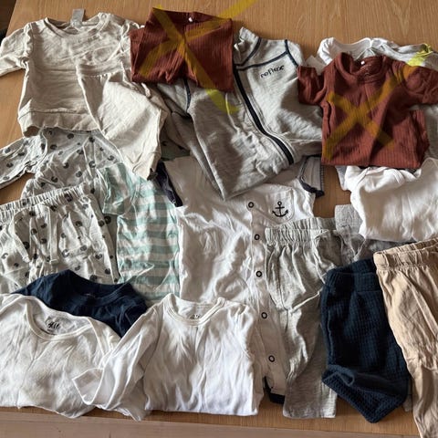 Selger en bukse, lue og sløyfe med matchende kamuflasjemønster. str 62/68.