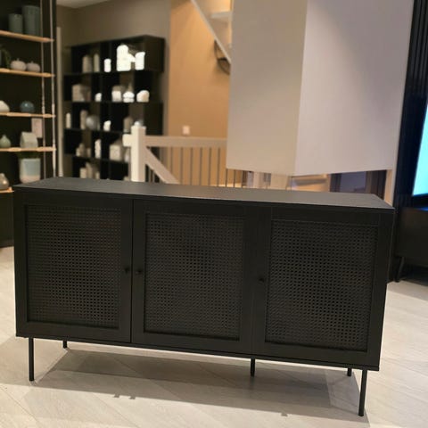 Svart hyllesystem som er veldig pent brukt. De løse hylleplatene er i svart aluminium og skapet er i eik