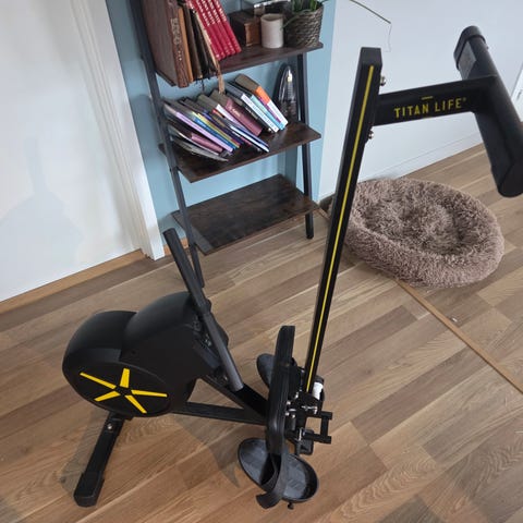 Romaskinen tar lite plass og kan vippes opp når den ikke er i bruk. Den kan også enkelt demonteres. Den er lite brukt