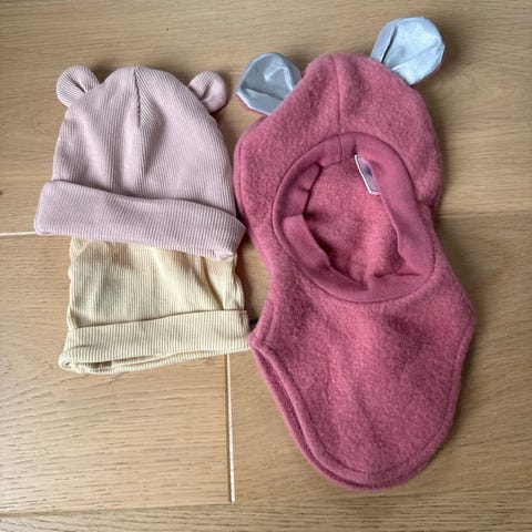 Reflex lue for barn i størrelse 43-45 cm. Luen er rosa med hvite striper og har to duskdetaljer på toppen. Den har knytesnor under haken for bedre passform.