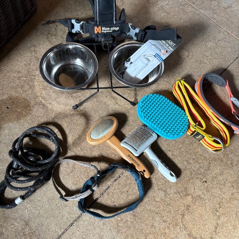 Sett med hunde/kattesele,Hunde/kattedrakt,i svart med blå detaljer, og to hundeskåler i rustfritt stål og en i keramikk med rosa kant. Passer for små til mellomstore hunder./katter.Klærne har knapper og er laget av stoff. Skålene har tekst og er egnet for mat og vann.I tillegg 2 typer børster og en neglesaks.