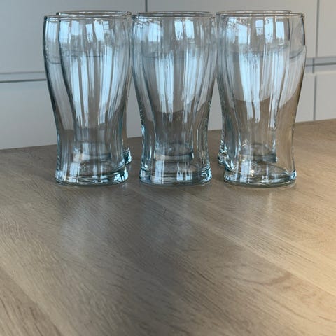 4 rødvinsglass, 4 kvitvinsglass og 6 ølglass. Husker ikkje kor det er kjøpt, mulig IKEA og Lagerhaus. Selges for 100,- pr sett. 200,- samla. Må hentast. Har ein liten skade på et rødvinsglass.