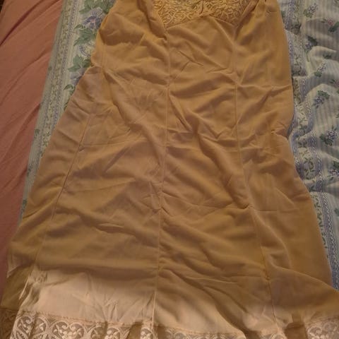 Fotsid kjole i liten størrelse kjøpt på kostymeutsalg i Den norske Opera (i dag Operaen). Gult stoff, trolig ull, mange forseggjorte detaljer.