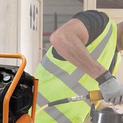 Bostitch Kompressor Luftkompressor i svart farge. Kompressoren har flere tilkoblingspunkter og måleinstrumenter for trykk. Designet med bærehåndtak for enkel transport og bruk.