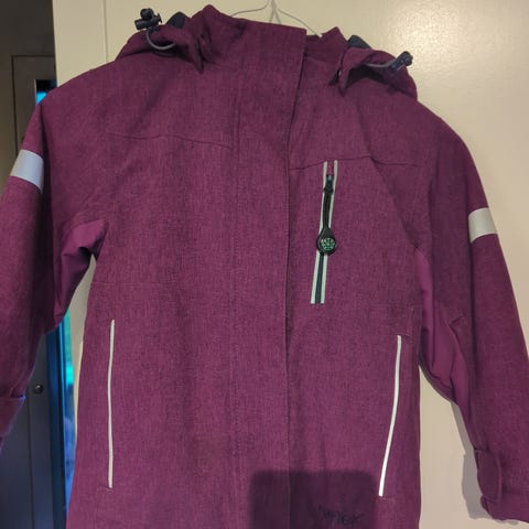Reflex barnejakke i størrelse 110. Brukt i skibakken to sesonger. Jakken er lilla, noe mørkere enn bildene viser. Har avtagbar hette og snølås. farge. reflekterende detaljer på ermer og rygg for økt synlighet. Pent brukt. Holder varmen godt.