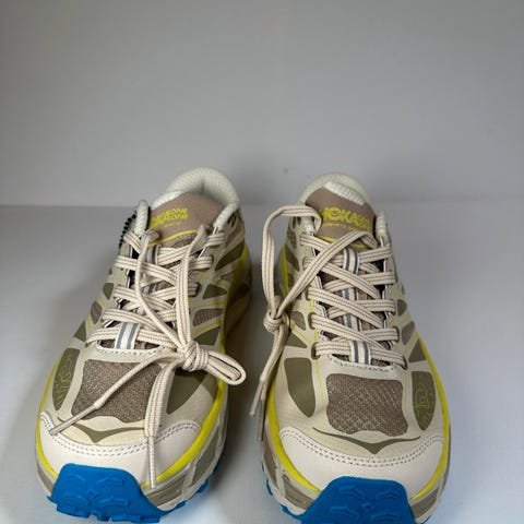 Hoka One One løpesko i størrelse 36, designet for løping. Skoene har en kombinasjon av grå og blå farger, med mesh-materiale som gir god pusteevne. Sålen har godt grep og demping, egnet for løping på ulike underlag.