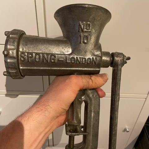 Spong Nr. 10 manuell kjøttkvern i god stand. Produsert i England.