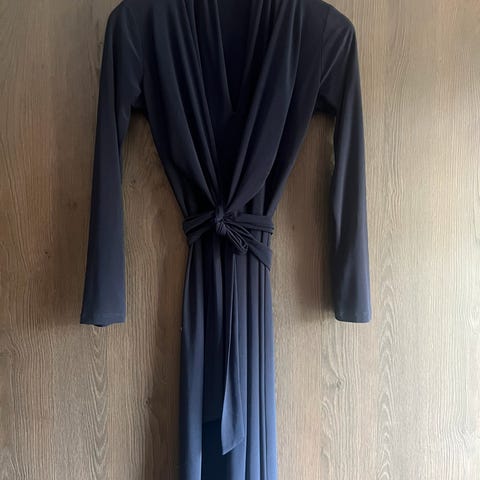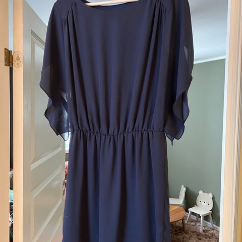 Kjole med vaffelstrikk og lommer i sidene. Litt kortere forran enn bak. Denimblå.