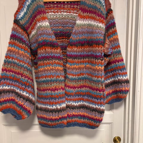 Hjemmestrikket ullgenser i topp tykk, tettstrikket og varm kvalitet, eget design med nedbrettbar hals og border i rødt og oransje. Passer best kortere personer i str S-M, se mål på ermelenge fra skulder, lenge bol og bredde i bilder.