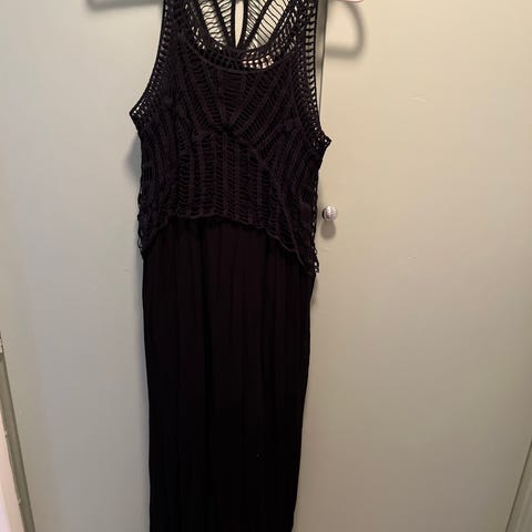 Kjolen er koksgrå melert og med fint mønster nederst. Den er ermeløs, med spesiell glidelås bak og av merket Segal. Lengde 90, bryst 94 og liv 90. 60 % bomull og 40 % polyester.
