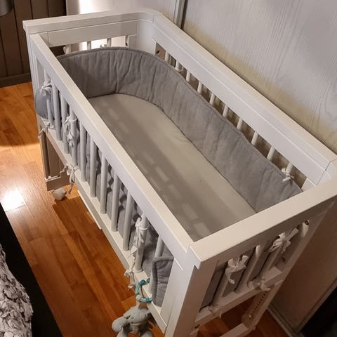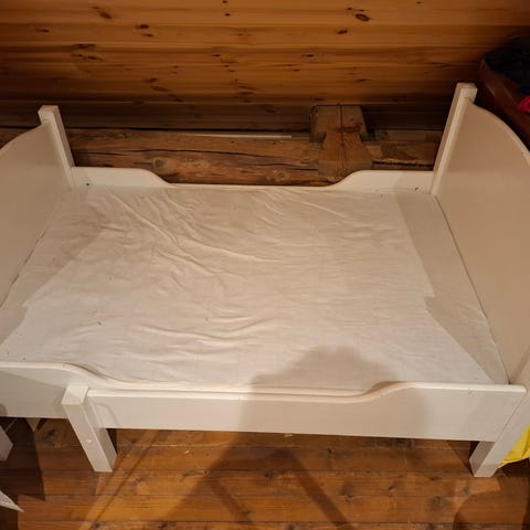 Følger med en tynn overmadrass ( 160cm) og en vogndyne (80x 100 cm) om ønskelig