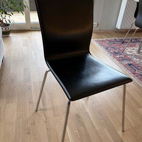 Sort skinnstol med rustfrie stål bein. Har blitt brukt som kontorstol.