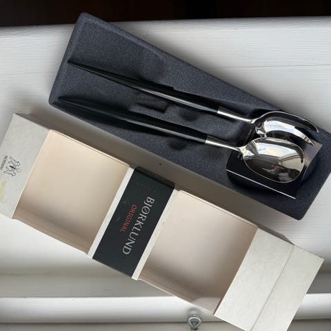 MEGET PENT. men skjeen ser ut til å ha en liten sprekk i skaftet bak (se siste bilde). Metallskjeen er meget STABIL I SKAFTET trass i dette. En knapt nok synlig skade, som ikke forstyrrer inntrykket av et pent bestikk. Sjekk bildene.