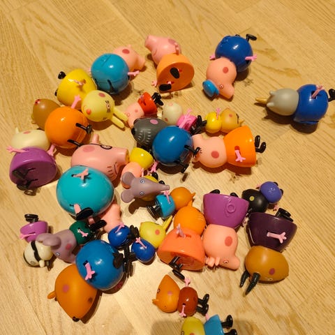 Peppa Pig lekefigurer inkludert fire deler: to voksne figurer, en liten figur og en gul and. Figurenes materiale er plast, og de egner seg for barn som liker Peppa Pig-serien.