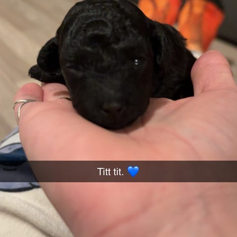 Ville er ensfarget svart, med sporer bak som et lite kjennetegn. Han har det beste eksteriøret og holdningen av valpene i kullet, så hvis du drømmer om å dra på en utstilling eller to er han det klart beste valget av guttene (sporer er ikke lengre listet blant feil i rasestandarden for puddel). Så lenge han bor hos meg kommer jeg til å melde han på valpeshow når han blir gammel nok, men det er ikke noen krav om at ny eier skal stille ut. Fysisk og mental stimulering, sammen med masse kos og kjærlighet er dog et ufravikelig krav :)