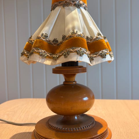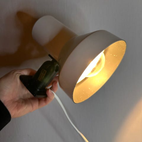 Lampene er vintage slutten av 1960-beg 1970. tallet.Sjelden utgave hittil ikke funnet på internett. Begge lampene er stemplet og etikett merket. Lengde ca 25 cm.Ut fra veggen 21 cm. Veggfeste 7,5 cm.Skjermen er ca 17,4 cm i diameter 14 cm lang.Pris pr.stk 1180 kr.