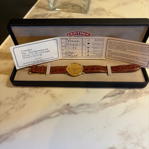 Leveres med mykt etui i filtmateriale med Certina-logo og eske. Selges som den er.