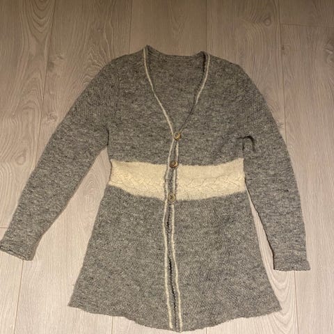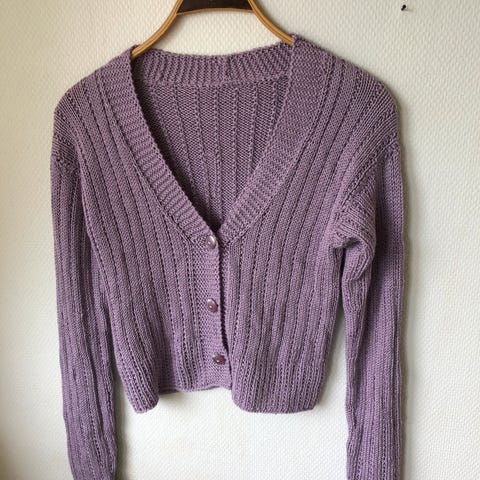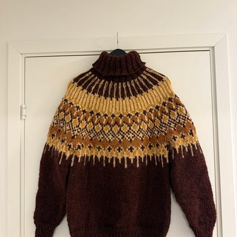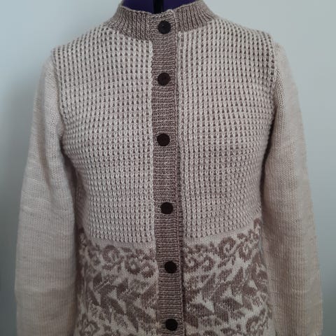 Brun hjemmestrikket jakke for dame i størrelse S. Jakken har en strukturert, grov strikk av bomullsgarn med knappestolpe foran og en bred, foldet krage. Hel lengde 76 cm, waist 78cm. Materialet er tykk og egnet for kjøligere vær. Jakken er designet for å gi varme og komfort.