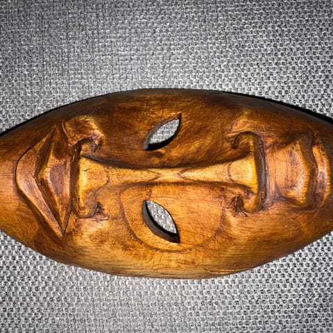 Håndlaget tremaske med dekorative utskjæringer og mønstre. Masken er brun og laget av tre, egnet for veggdekorasjon eller samlerobjekt.