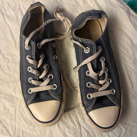 Converse unisex joggesko i størrelse 39,5 med svart farge. Skoene har hvite lisser og hvit såle med svart detalj. Materialet ser ut til å være klassisk canvas med gummisåle. Passer til barn og ungdom.