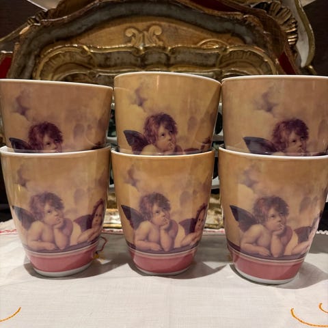 4 kuvert i god stand. Romantisk og flott turkis farge. Passer godt til afternoon tea. Ingen knagg, en tallerk har et bruksspor/skrape. Intakt gullkant. Pris pr kuvert.