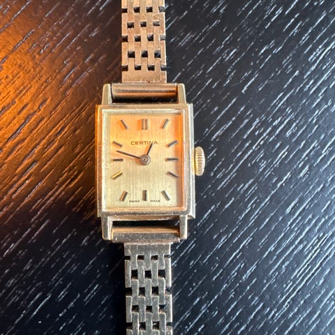 Certina dame 18K gullklokke. Certina-klokker er velkjente for sin presisjon, pålitelighet og sporty karakter. Siden de så dagens lys helt tilbake i 1888 har denne sportsklokke-produsenten etablert seg som et merke som lager klokker av ekte “Swiss Made” kvalitet.