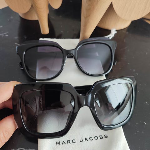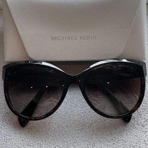 A Kjærbede Dame solbriller med svart ramme og mørke glass. Inkluderer et mykt oppbevaringsetui i grått materiale. Lite brukt.