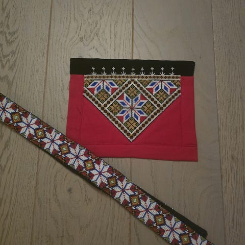 Bringeduk og belte i perler til Hardangerbunad. Beltet er 98 cm langt