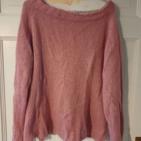 Pent brukt hjemmestrikket genser. Garnpakken koster 1098 kr.