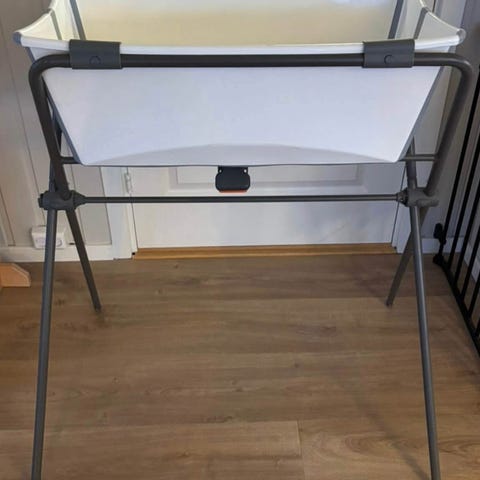 Selger et stellebord fra Basson Baby med badekar, hyller og hjul med lås.