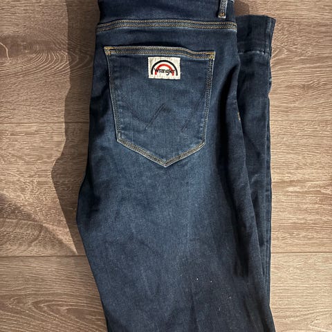 Det Flare jeans fra Wrangler i størrelse 32, og lengde 34. Det tilsvarer ca størrelse M/L.