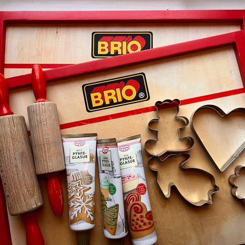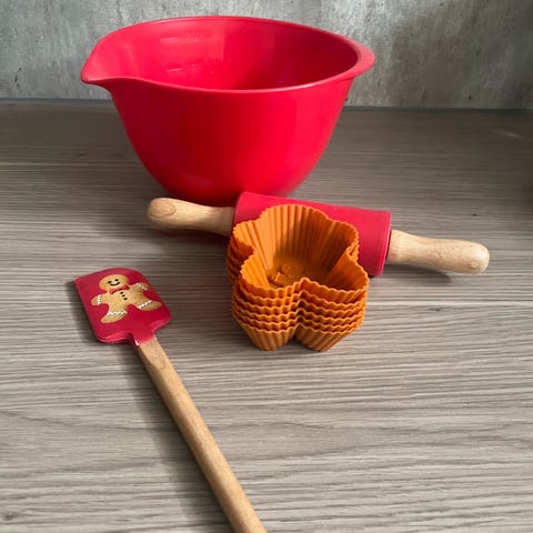 Bakesett for barn. Kjevle, kakeform og brødform
