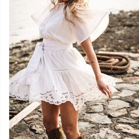 Denne er blitt lite brukt for den ble kjøpt litt for stor men den er utrolig fin. Store ballong armer, kjolen skrår utover fra armhulen og har stor vidde nederst med tyll under den nederste kappen. Jeg selger den billig til å ikke være brukt mer en en gang eller to.