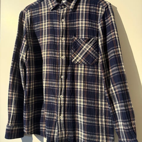 Stilig rutete herreskjorte i blå og hvit farge. Mykt stoff, behagelig å ha på. Som ny, brukt kun én gang. Størrelse M.