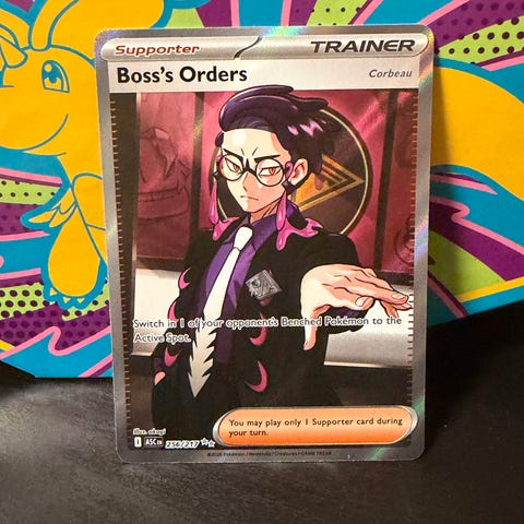 Innholdet i forseglingen er illustrert på bilde nr 3 i annonsen. Det er 1 promo kort av Boss's orders swsh251 og x3 kort av boss's orders #132