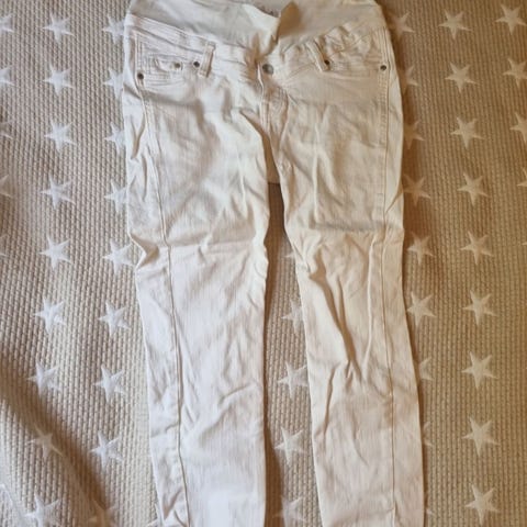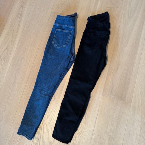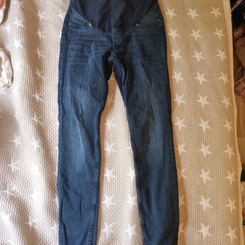 Lommer foran og knapp kun til «pynt». Ingen hull. God stretch i stoffet rundt magen. Strikk i god stand.