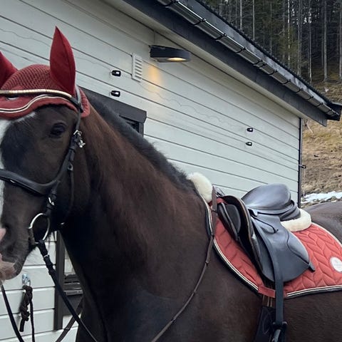 Pent brukt Sjabrakk selges med matchende ørehette og en til ørehette som fungerer som erstatning for propper i øra på hesten. Den er i størrelse esel ører 😂 men alt i alt er det str full